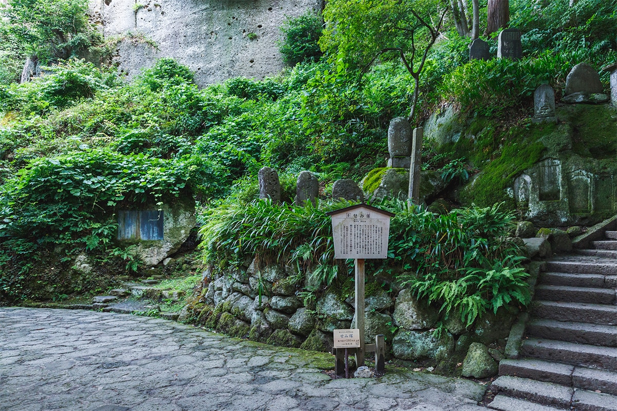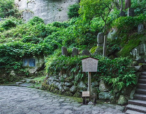 背後の岩窟には新庄藩戸沢家歴代の石碑が立ち、また道の向かい側には、山形城主最上義光公霊屋があり、最上一族の霊を本尊となる一寸一社の地蔵尊によって祀っています。