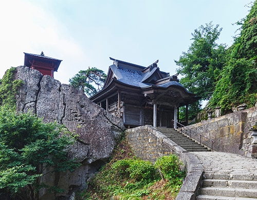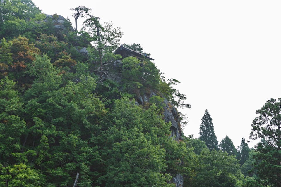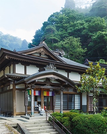 百丈岩の上に立つ開山堂は立石寺を開かれた慈覚大師の御堂で、この御堂が建つ崖下にある自然窟に大師の御遺骸が金棺に入れられ埋葬されています。御堂には大師の木造の尊像が安置されており、朝夕、食飯と香が絶やさず供えられ護られています。普段は扉の閉じられた御堂ですが、年に一度、大師のご命日に当たる一月十四日に法要が行われ御開帳されます。