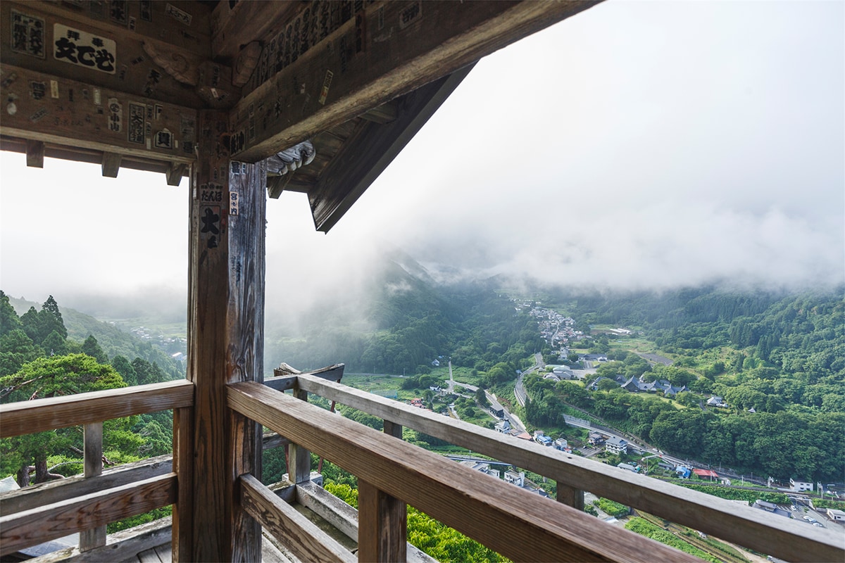 向かって左、岩の上の赤い小さな堂は写経を納める納経堂で、山内で最も古い建物です。ここに奥之院で四年をかけ写経された法華経が納められます。県指定文化財で、昭和六十二年に解体修理が行われました。またここより向かって右上には五大明王を奉る五大堂があります。舞台造りのこの御堂からは山寺を一望でき、絶景を楽しむことができます。
