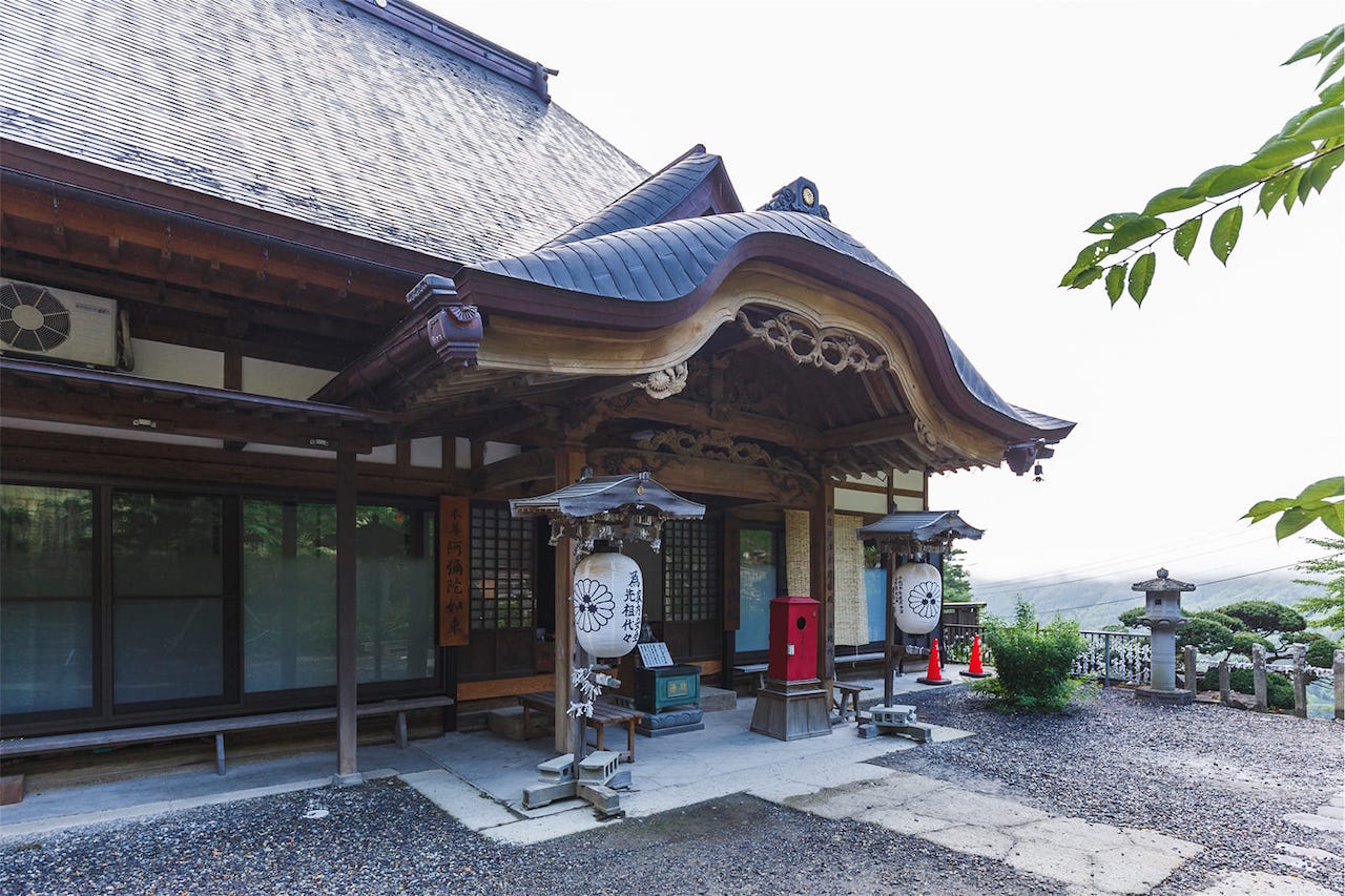昔は山上にあった十二支院の一つで慈覚大師作と伝えられる阿弥陀如来を本尊とし運慶作の毘沙門天を安置し、明治元年に山の善行院、極楽院を合併され現在に至ります。